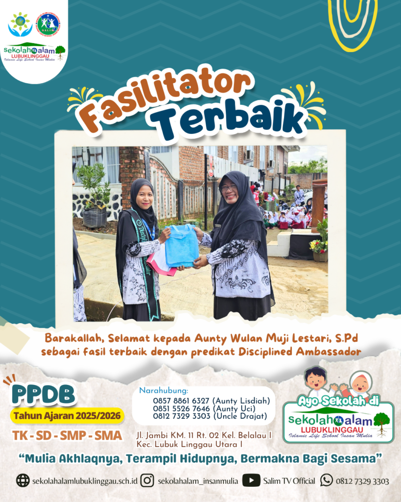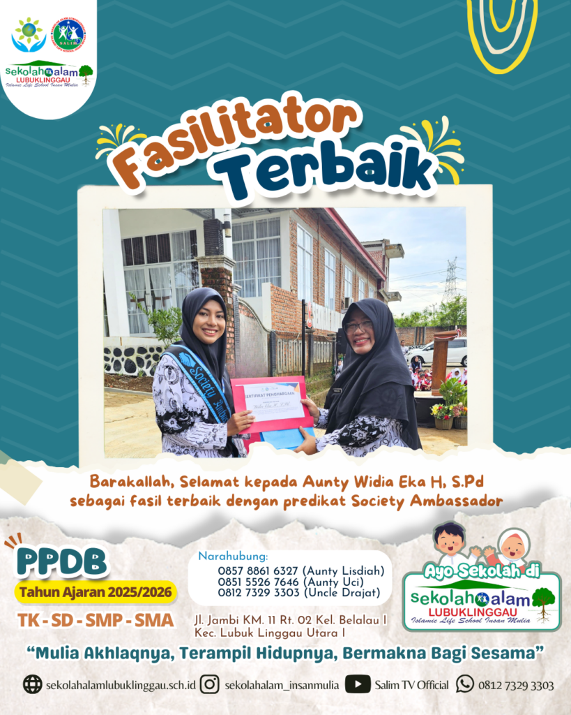 Setelah itu dilanjutkan pengumuman fasil terbaik. Penilaian fasil terbaik ini telah dilihat selama 1 semester ini. Adapun fasil terbaik dengan predikat society ambassador diberikan kepada aunty Widia Eka H, S.Pd yaitu wali kelas 1B SD Alam, sedangkan fasil terbaik dengan predikat disciplined ambassador diberikan kepada Aunty Wulan Muji Lestari, S.Pd wali kelas 9 SMP Alam.