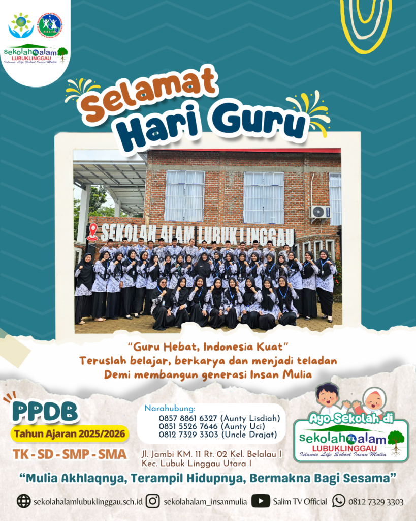 “Guru Hebat, Indonesia Kuat” itulah tema hari guru nasional 2024. Senin, 25 November 2024 Sekolah Alam Lubuklinggau melaksanakan upacara bendera dalam rangka memperingati hari guru. Berbeda dari upacara lainnya, khusus hari guru yang menjadi petugasnya adalah uncle dan aunty sekolah alam. Petugas-petugas upacara kali ini yaitu sebagai berikut.
